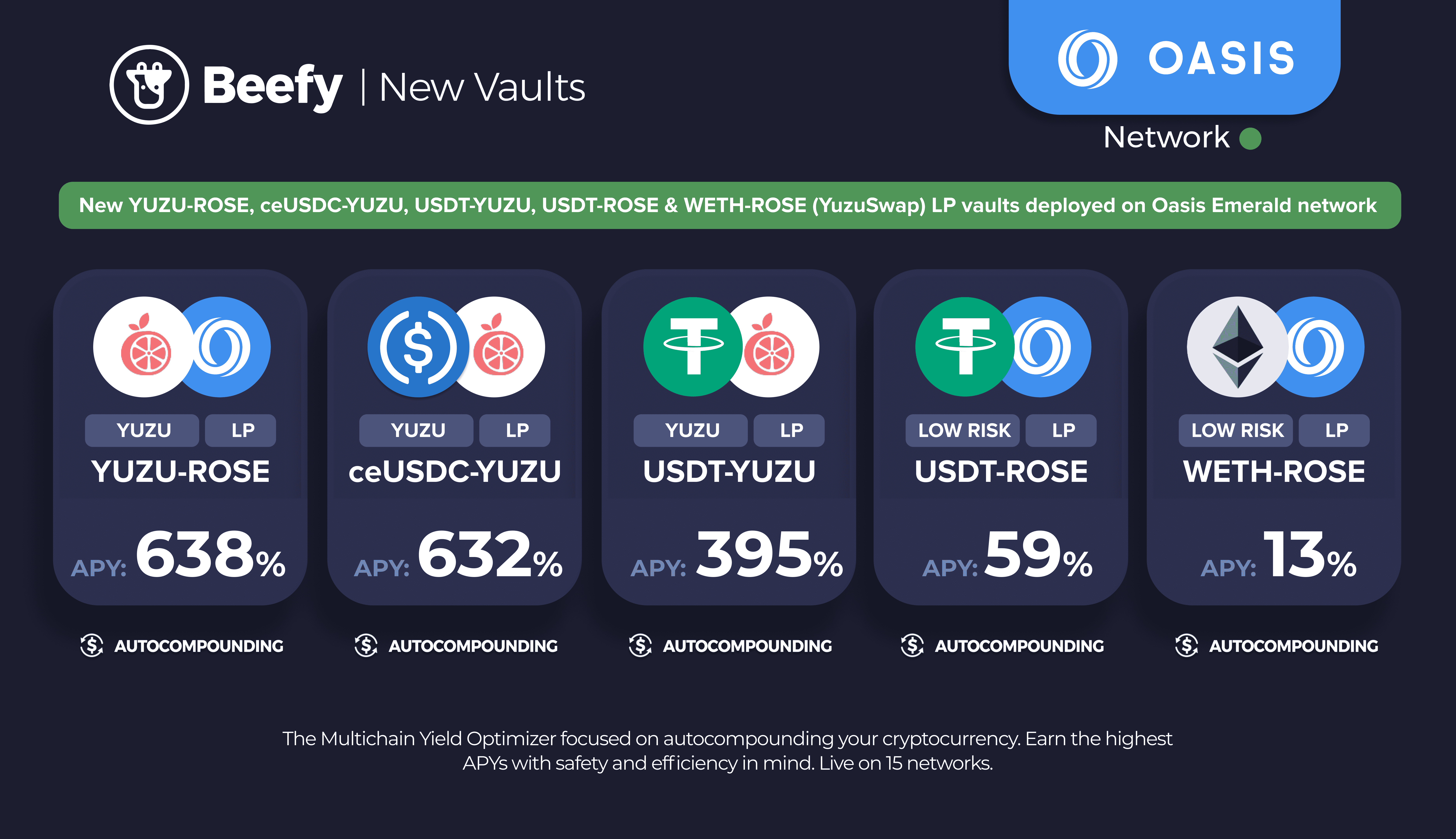 To start our Oasis Network deployment, we’ve chosen to autocompound on Yuzuswap. Yuzuswap is the first DEX built on Oasis and offers a Uniswap-style experience. This makes it a great opportunity for Beefy to do what it does best: maximize your Oasis Network yield. Our Yuzuswap Vaults could also lead to a BIFI-ROSE pair from the partnership.