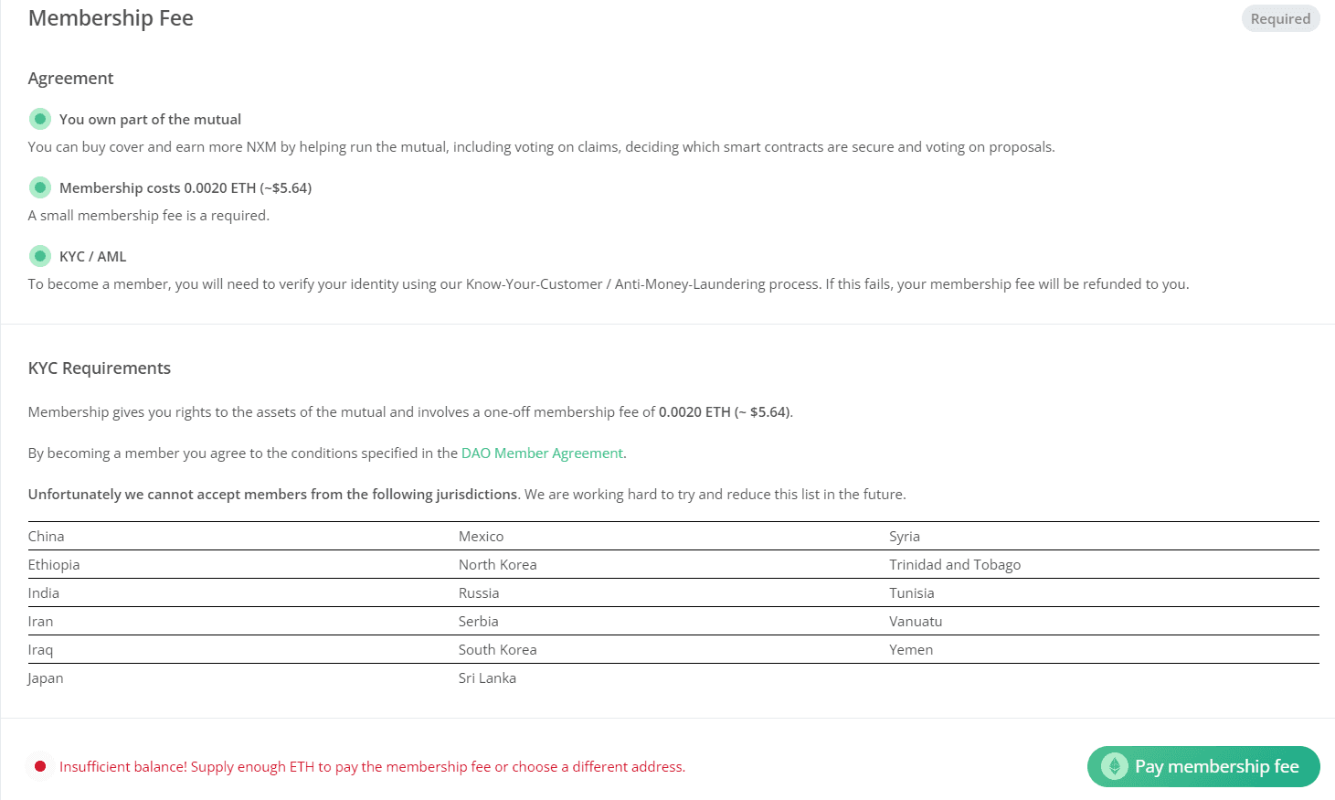 First, head to Nexus Mutual, connect your wallet and pay your membership fee to join the Mutual.
