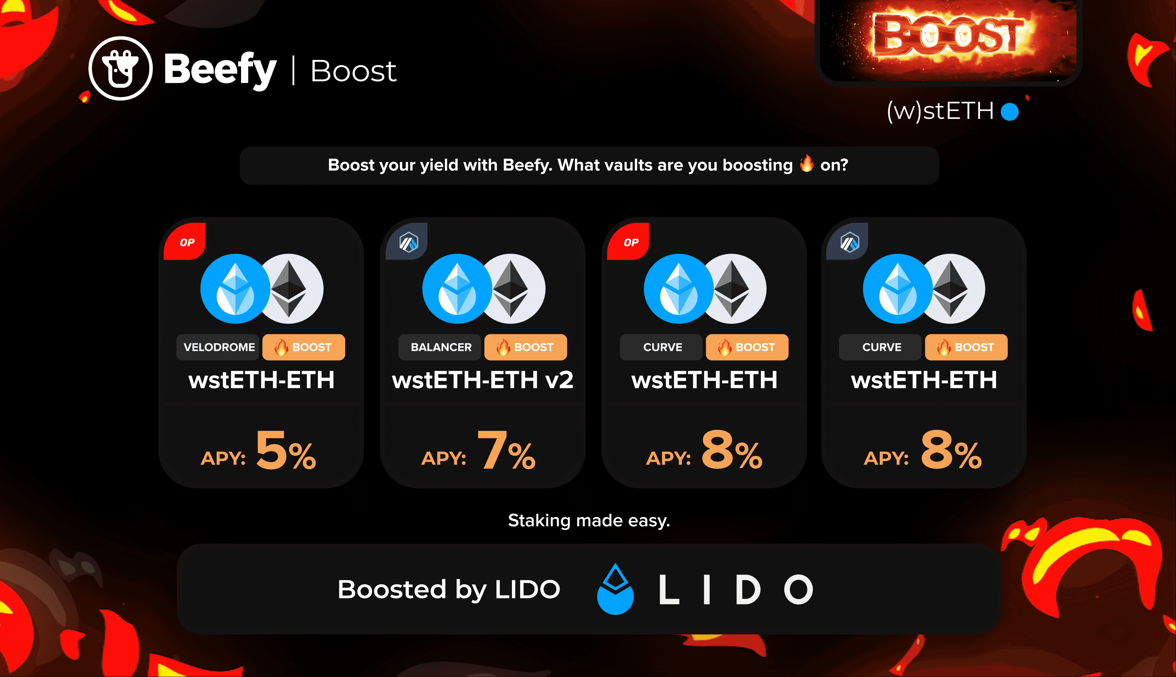 By now, the Beefy-Lido partnership has reached the status of legend, having delivered round after round of boosts on tens of Beefy vaults. As liquid-staking derivatives continue to grow and benefit from Ethereum’s development, Beefy will be there every step of the way, helping to deliver these benefits - together with the miracle of autocompounding - to our users.