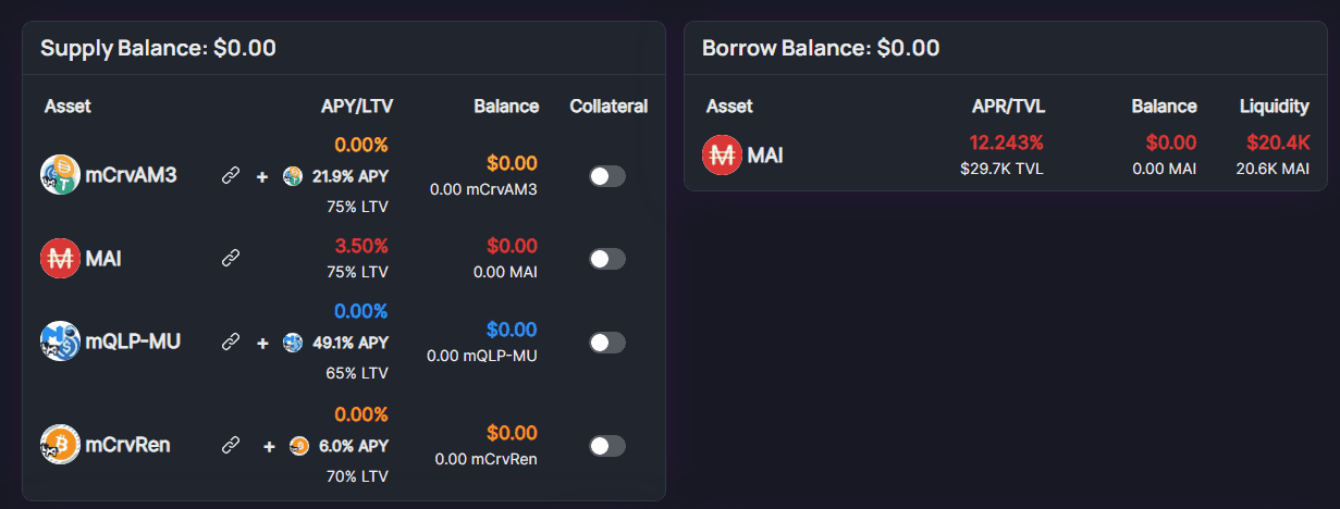 You can mint MAI directly from Mai.Finance, at 0% interest, and get charged a 0.5% fee when repaying your debt. You can also lend your tokens directly on Market.xyz, and borrow MAI at a variable rate depending on pool utilization.